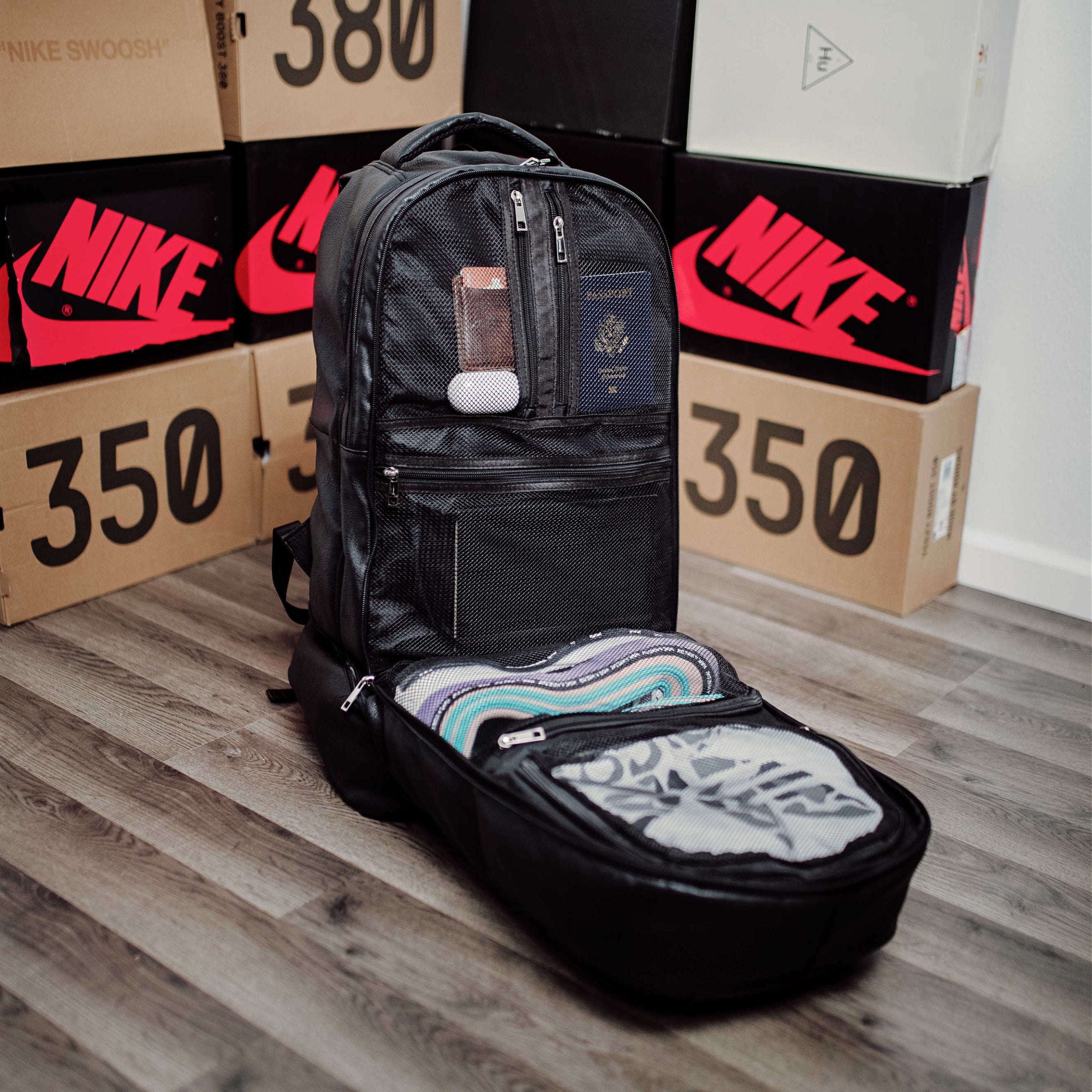 Our Signature Design bag is built to hold 5 pairs of shoes, clothes, laptop, and more!