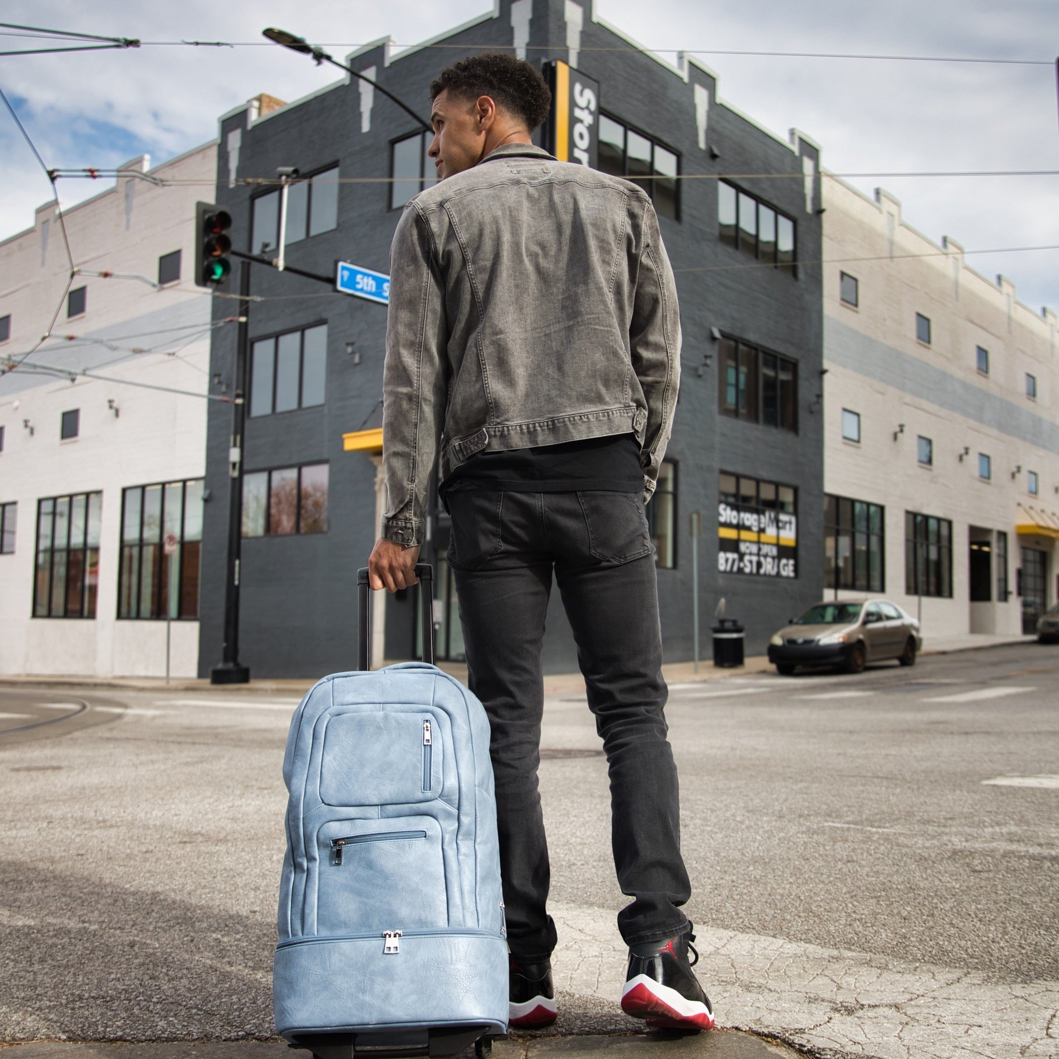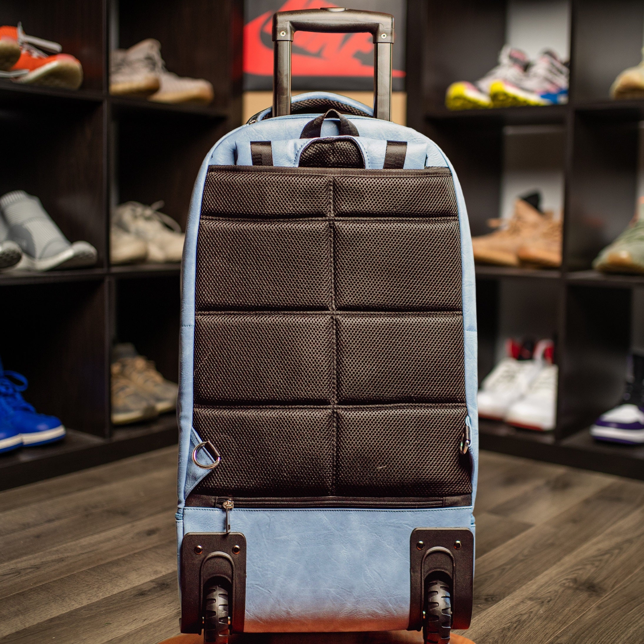 Our Baby Blue Tumbled Leather Roller Bag has taken the world by storm by carrying up to 5 pairs of shoes, clothes, laptops, travel essentials, and much more! The best part of it all, our bags fit neatly in the overhead bin of commercial airlines.